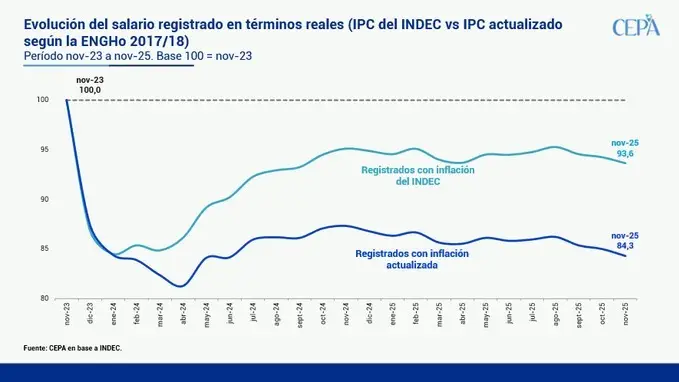 En resumen: los trabajadores sufrieron una caída de 6,4% en salarios registrados (públicos y privados) desde noviembre 2023. Sin embargo, si se ajusta el índice de salarios registrados por inflación mediante la canasta de consumo que el Indec utilizará a partir de febrero, la pérdida del poder adquisitivo entre noviembre de 2023 y noviembre de 2025 alcanza el 15,7%.
