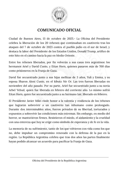 Según el texto publicado desde el Poder Ejecutivo, las personas liberadas continuaban en cautiverio “tras los ataques del 7 de octubre contra el pueblo judío en el sur de Israel” y se destacó el accionar del presidente de Estados Unidos, Donald Trump, que fue calificado como “el artífice de este hito en camino hacia la paz en Medio Oriente” .