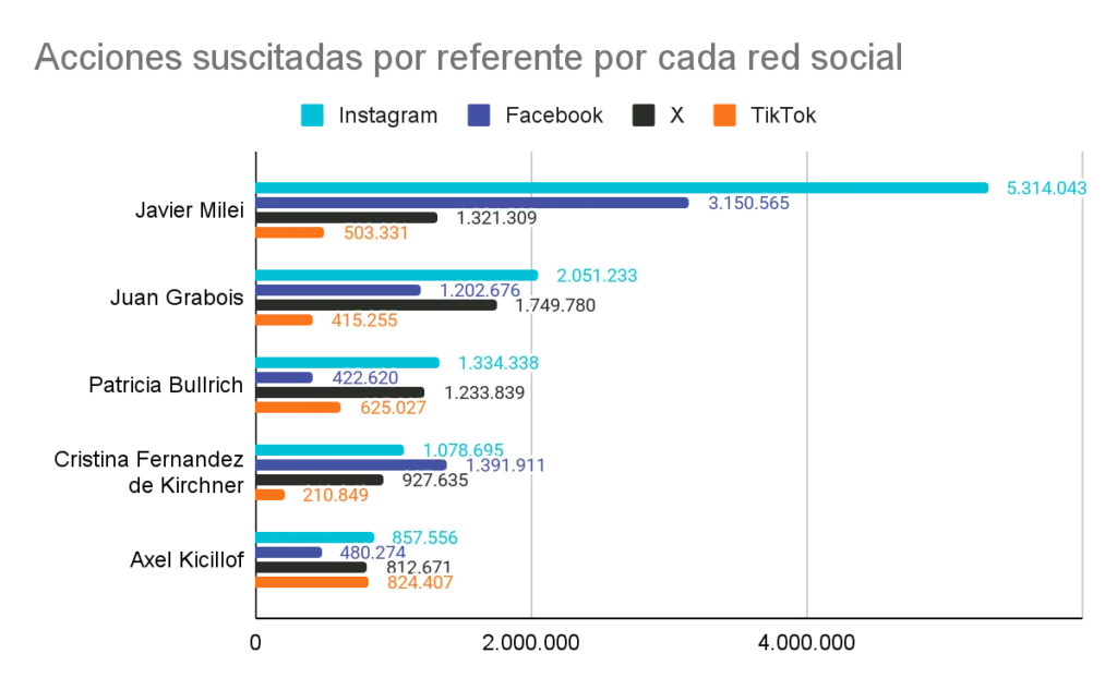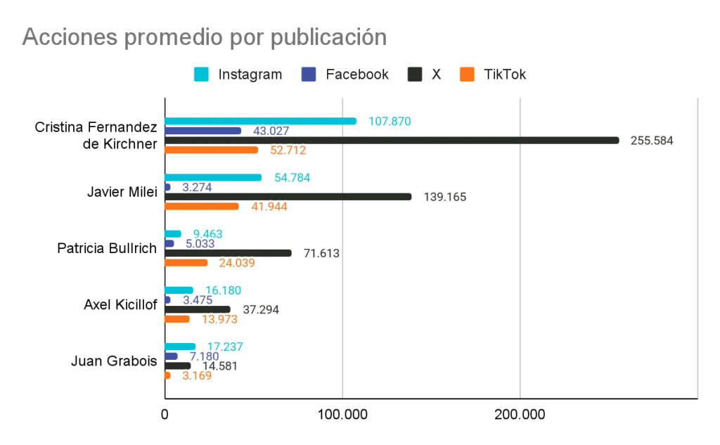 Las acciones son expresión de la vitalidad comunicativa. Conjugan las reacciones (me gusta), los comentarios, los compartidos y los guardados que la comunidad realiza. En el primer gráfico vemos la cantidad total de acciones suscitadas por cada referente por red social. En cambio en el siguiente, vemos esa cantidad dividida por la cantidad de publicaciones. Aquí podemos apreciar los alcances que logra cada referente en promedio cada vez que toma la palabra. Puede haber cuentas con millones de seguidores que no presentan actividad en una determinada etapa, cuentas que realizan muchas publicaciones y así alcanzan gran cantidad de acciones, u otras que realizan pocas publicaciones pero cada vez que hablan logran un alto volumen de participación social.