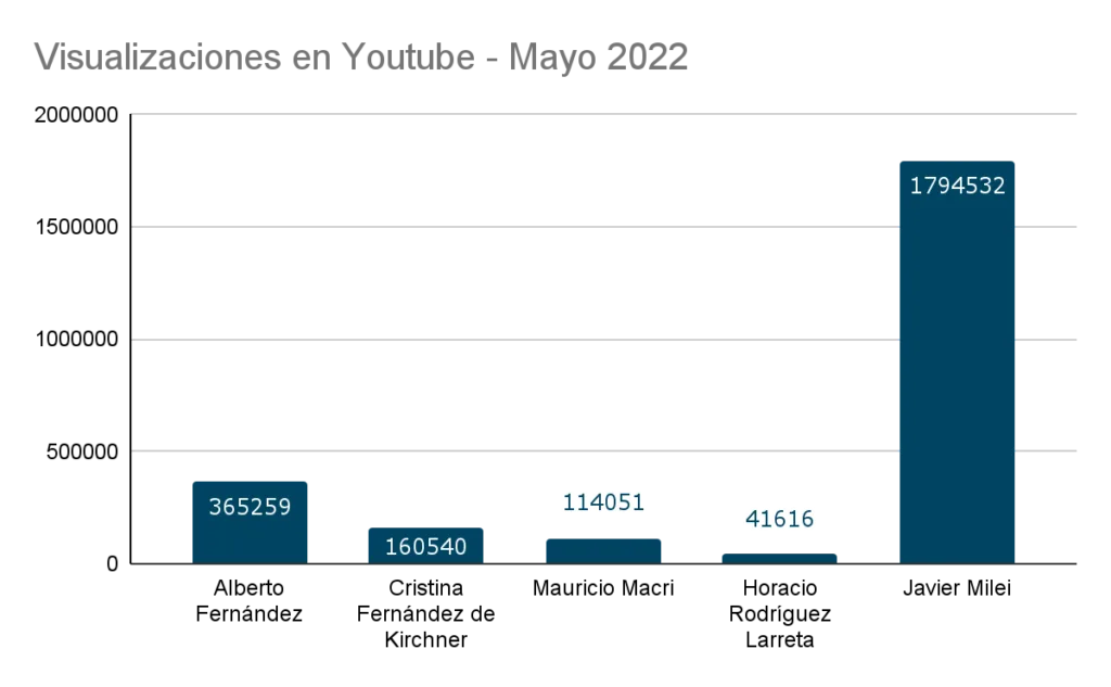 En mayo de 2022, el término de búsqueda “Javier Milei” fue el de mayor porcentaje de visualizaciones (72%), seguido por “Alberto Fernández” (15%), “Cristina Fernández de Kirchner” (6%), “Mauricio Macri” (5%) y “Horacio Rodríguez Larreta” (2%).