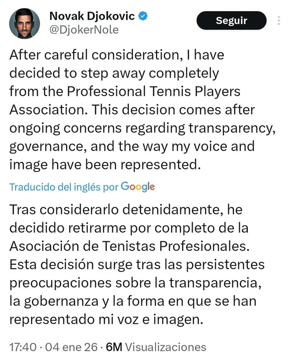 “Tras considerarlo detenidamente, he decidido retirarme por completo de la Asociación de Jugadores de Tenis Profesionales. Esta decisión surge tras las persistentes preocupaciones sobre la transparencia, la gobernanza y la forma en que se han representado mi voz e imagen”, escribió el ex número uno del mundo, en un mensaje que generó un fuerte impacto en el ambiente del tenis internacional.