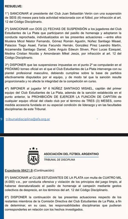 Según el fallo del Tribunal de Disciplina, el presidente del club, Juan Sebastián Verón, quedo suspendido durante seis meses para “toda actividad relacionada con el fútbol, por infracción al artículo 12 del Código Disciplinario”.