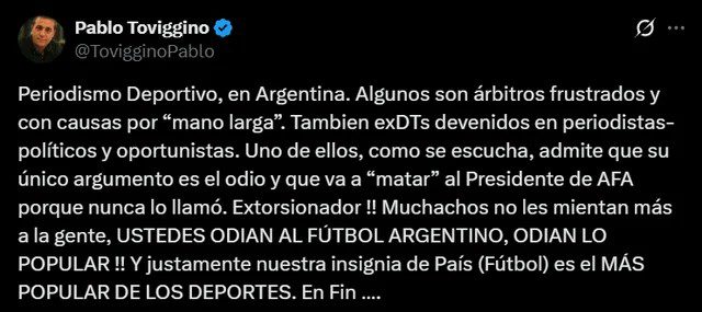 Este posteo se suma a una larga lista de publicaciones en la red social X (anteriormente llamada Twitter), en las que Toviggino convive con el conflicto hacia todos los críticos de la actual dirigencia de AFA.