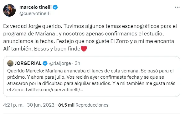 Y Marcelo, una vez más, respondió: «Es verdad Jorge querido. Tuvimos algunos temas escenográficos para el programa de Mariana, y nosotros apenas confirmamos el estudio, anunciamos la fecha. Festejo que nos guste El Zorro y a mí me encanta Alf también. Besos y buen finde», cerró.