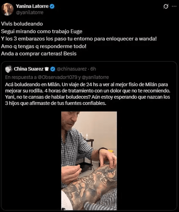 Como era de esperarse, la respuesta de Latorre no tardó. Citó el tuit de Suárez y contraatacó: “Vivís boludeando. Seguí mirando cómo trabajo, Euge. Los tres embarazos los pasaron desde tu entorno para volver loca a Wanda”. Con ironía, remató: “Andá a comprar carteras. Me encanta que tengas que responderme todo. ¡Besis!”.
