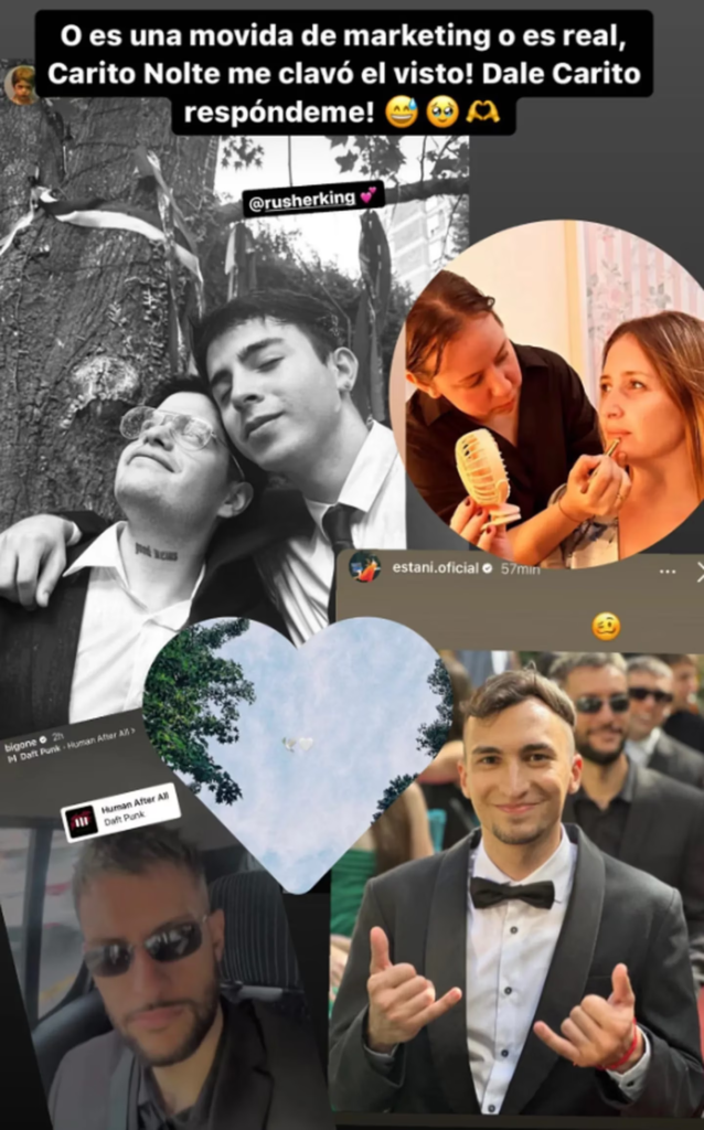 Una de las fotos tiene como detalle la cola de un vestido blanco y un escrito que dice “Casorio”, con un emoji de anillo, que alertó a los fanáticos de la pareja. En otra de las postales, aparecen los novios muy sonrientes: ella con un vestido blanco y un curioso cinturón XXL de cuerina que entalla su cintura, y el rapero de traje formal.