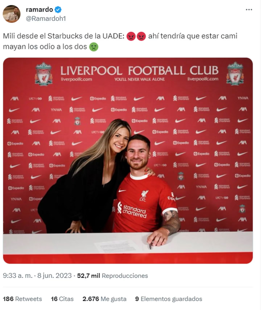 Alexis Mac Allister, hace tan solo unas horas, fue anunciado como el nuevo jugador del Liverpool, club que lo contrató a cambio de más de 40 millones de dólares. Pero, en las redes la noticia fue otra. “Camila debería estar en ese lugar”, expresaron varios internautas muy molestos por la presencia de la nueva pareja del Campeón del Mundo, Ailén Cova.