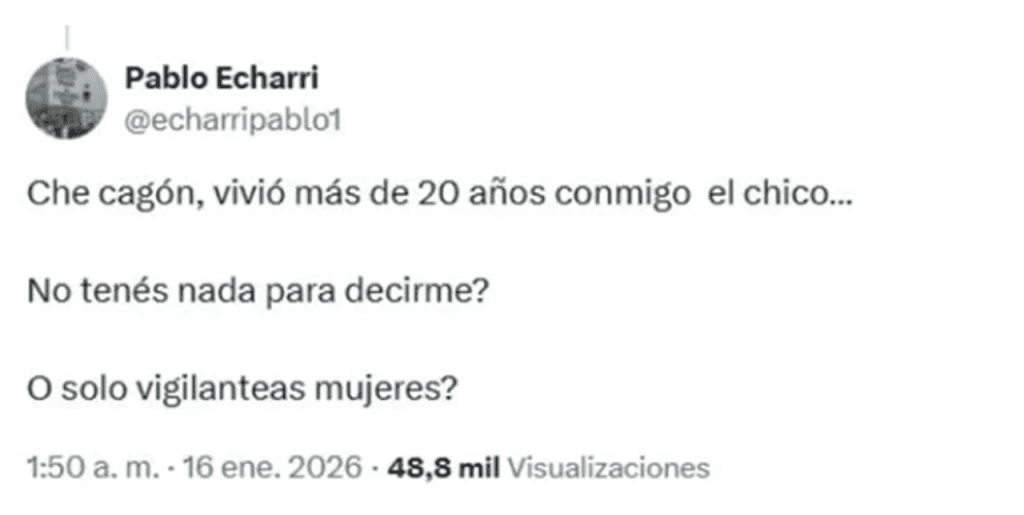 Quien también se sumó al cruce fue Pablo Echarri. Desde la misma red social, el actor decidió enfrentar al periodista con un mensaje de tono más filoso, respaldando públicamente a su esposa y al hijo de ella: “Che, cagón. Vivió más de 20 años conmigo el chico. ¿No tenés nada para decirme?, ¿O solo vigilanteás mujeres?”.