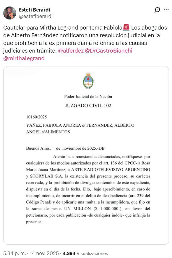Estefanía Berardi lo reveló en la red junto a una captura: «Cautelar para Mirtha Legrand por tema Fabiola. Los abogados de Alberto Fernández notificaron una resolución judicial en la que prohíben a la ex primera dama referirse a las causas judiciales en trámite«.