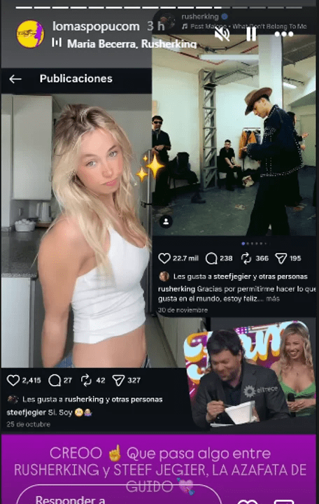 Todo inicio cuando desde la cuenta de Instagram, lomaspopu hicieron un post enigmático en sus historias. Al parecer la implicada en este nuevo amorío sería Stef Jegier, una joven modelo y azafata del programa de Guido Kaczka.