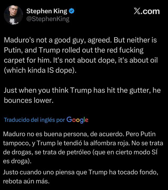 En su mensaje, el escritor fue todavía más lejos y apuntó directamente a los verdaderos motivos que, a su entender, impulsan este tipo de decisiones geopolíticas: “No se trata de drogas, se trata de petróleo (que en cierto modo SÍ es droga)”.