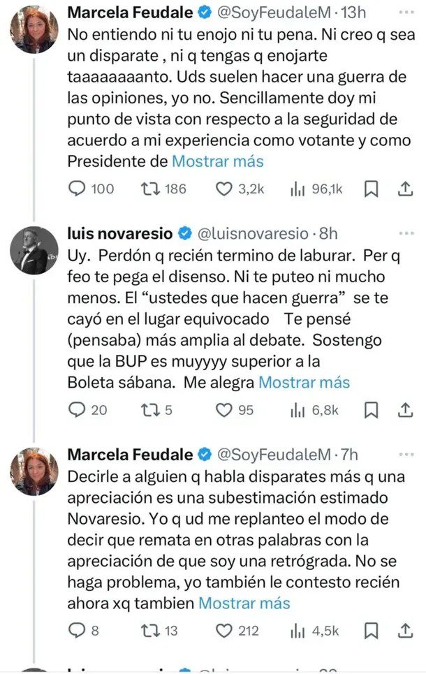 Feudale, en su última réplica, defendió su postura y criticó la apreciación del periodista: «Decirle a alguien que habla disparates más que una apreciación es una subestimación, estimado Novaresio. Yo que Ud. me replanteo el modo de decir que remata en otras palabras con la apreciación de que soy una retrógrada. No se haga problema, yo también le contesto recién ahora porque también recién término de laburar. No lo reconocí por tu posteo. No hablé de la boleta, hablé de la seguridad de la boleta. Parece que falla la comprensión. Saludos».