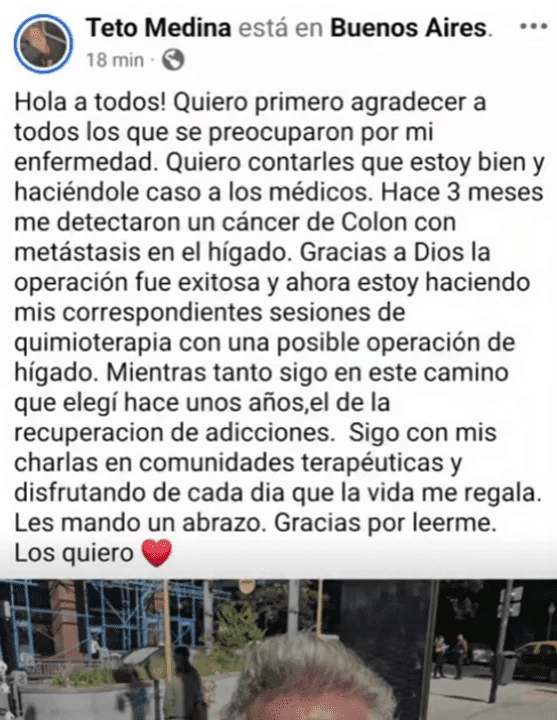 “Hola a todos! Quiero primero agradecer a todos los que se preocuparon por mi enfermedad. Quiero contarles que estoy bien y haciéndole caso a los médicos. Hace 3 meses me detectaron un cáncer de colon con metástasis en el hígado”, escribió en su posteo.