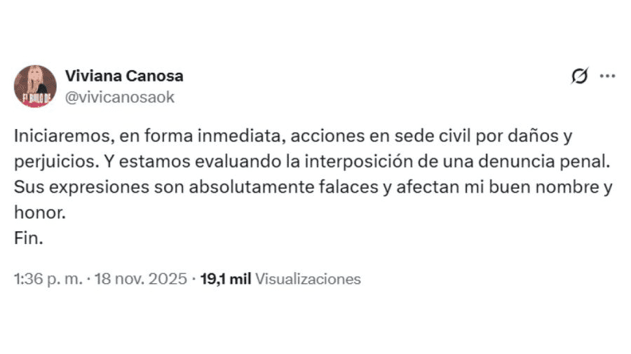 «Y estamos evaluando la interposición de una denuncia penal. Sus expresiones son absolutamente falaces y afectan mi buen nombre y honor. Fin«. concluyó la conductora su anuncio.