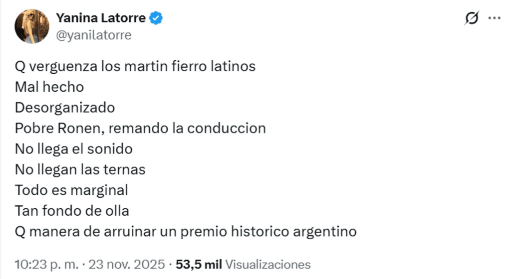 Fiel a su estilo, la histórica panelista de LAM no dejó pasar de alto ningún detalle de la ceremonia: “Que vergüenza los Martín Fierro Latinos. Mal hecho. Desorganizado. Pobre Ronen, remando la conducción. No llega el sonido. No llegan las ternas. Todo es marginal, tan fondo de olla. Qué manera de arruinar un premio histórico argentino.