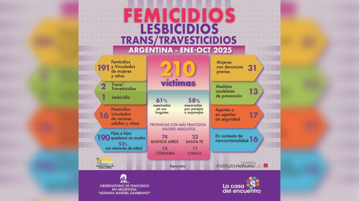 Desde el 1° de enero del 2025, Argentina sumó 210 víctimas mortales en el contexto de violencia de género, según el informe del Observatorio de Femicidios «Adriana Marisel Zambrano». La cifra incluye 191 femicidios y vinculados de mujeres y niñas, 1 lesbicidio, 2 transfemicidios y 16 femicidios vinculados de varones adultos.