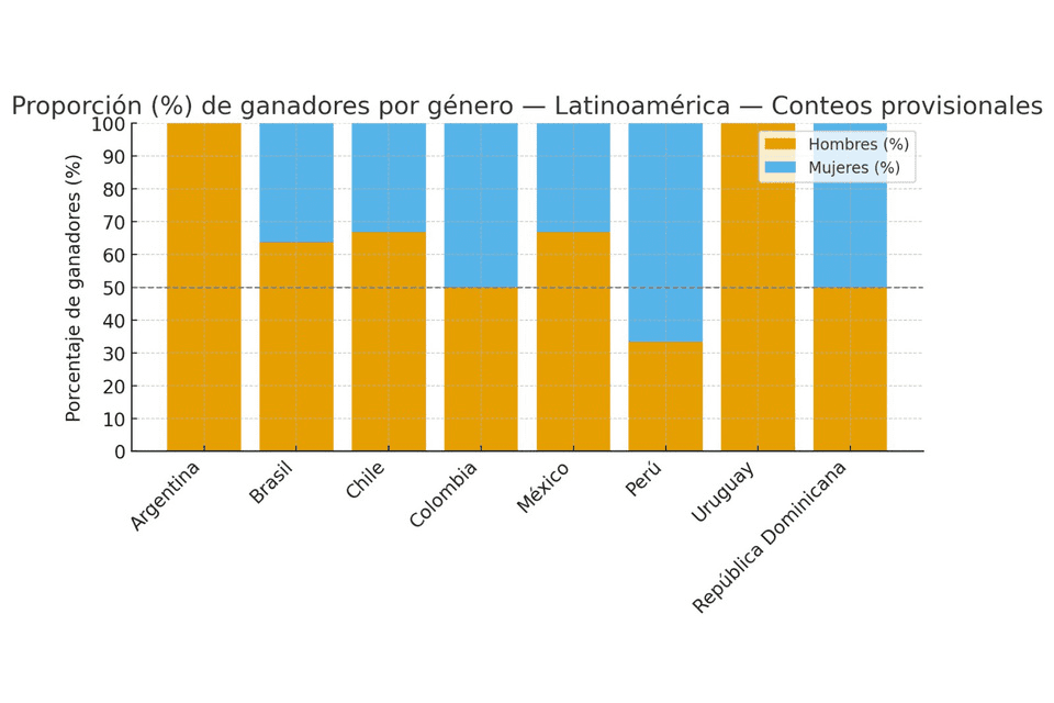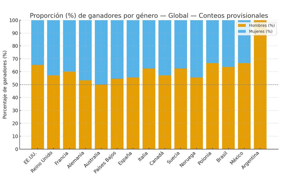 * En algunos países, como Estados Unidos y Brasil, el porcentaje de ganadores varones ronda el 70 por ciento.