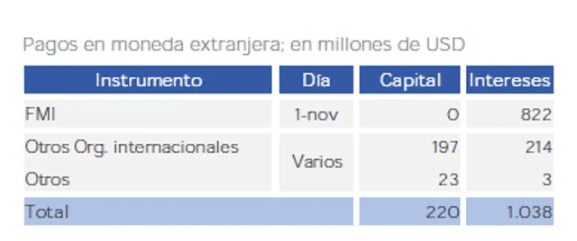 El total de vencimientos en moneda extranjera durante noviembre asciende a US$ 1.038 millones, al sumar otros US$ 217 millones que vencen con diferentes organismos multilaterales.