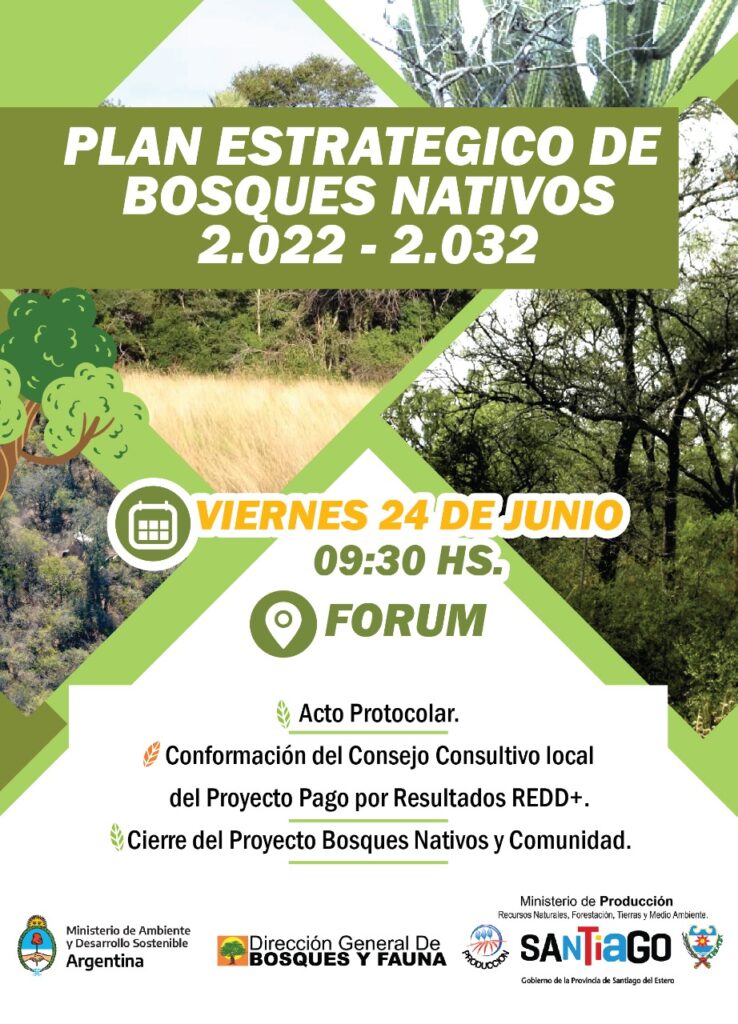 Este viernes 24 de Junio a las 9:30 horas en el Centro de Convenciones FORUM, la Dirección General de Bosques y Fauna de Santiago del Estero realizará la presentación oficial del Plan Estratégico de Bosques Nativos 2022-2032, en el cual se definen los lineamientos y actividades a financiar por la Ley 26.331 para la conservación, aprovechamiento y manejo sostenible de los bosques nativos de la provincia.