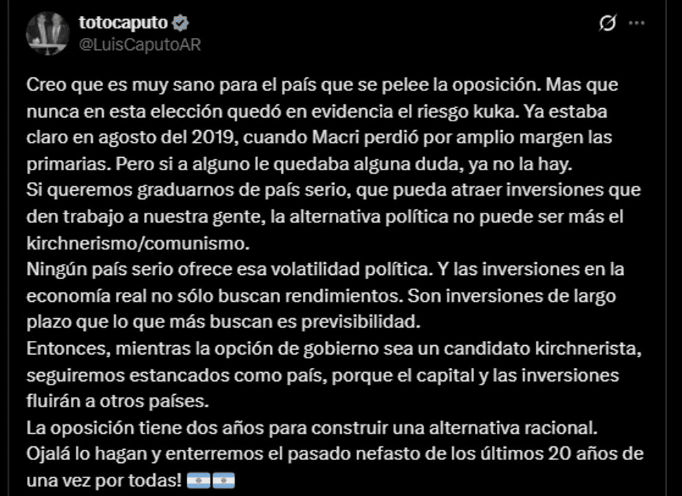 En ese marco, Caputo sostuvo que “si queremos graduarnos de país serio, que pueda atraer inversiones que den trabajo a nuestra gente, la alternativa política no puede ser más el kirchnerismo/comunismo”.