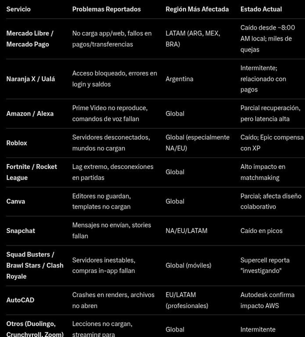 Todo comenzó cuando usuarios de distintas partes del mundo empezaron a reportar fallas simultáneas en redes sociales, servicios financieros y aplicaciones de entretenimiento. Entre las más afectadas se encontraron gigantes como Fortnite, Canva, Roblox, Disney+, Steam, Snapchat y el buscador de inteligencia artificial Perplexity. En Argentina, los problemas alcanzaron de lleno a Mercado Pago, Naranja X y Ualá, donde los usuarios no pudieron realizar pagos ni acceder a sus cuentas.