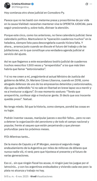 “Hoy comienza otro show judicial en Comodoro Py. Parece que no les bastó con meterme presa y proscribirme de por vida en la causa Vialidad: necesitan mantener viva la opereta judicial para seguir presionando y, sobre todo, distraer la atención”, escribió la ex mandataria en su cuenta de X.