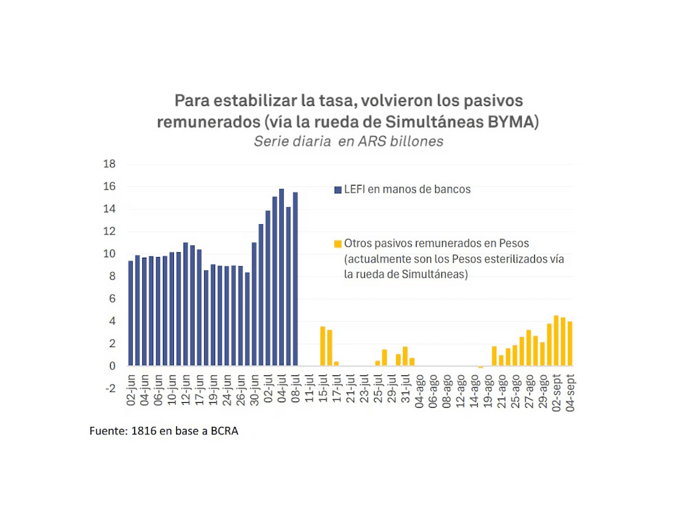El Banco Central no ajustaría nuevamente el nivel de exigencia de encajes mínimos -remunerados a través de la contabilización de tenencias de letras o a tasa cero-, por lo que no habría cambios previos a la operación de deuda en pesos, algo que sí había tenido lugar en las últimas ocasiones. “De no lograr un rollover (refinanciación)del 100%, el Tesoro podría absorber el excedente tal como estuvo haciendo en la ventana de pases pasivos incrementando su posición a partir de la última licitación de agosto ($4,2 billones al 5 de septiembre)“, consideró Portfolio Personal Inversiones.