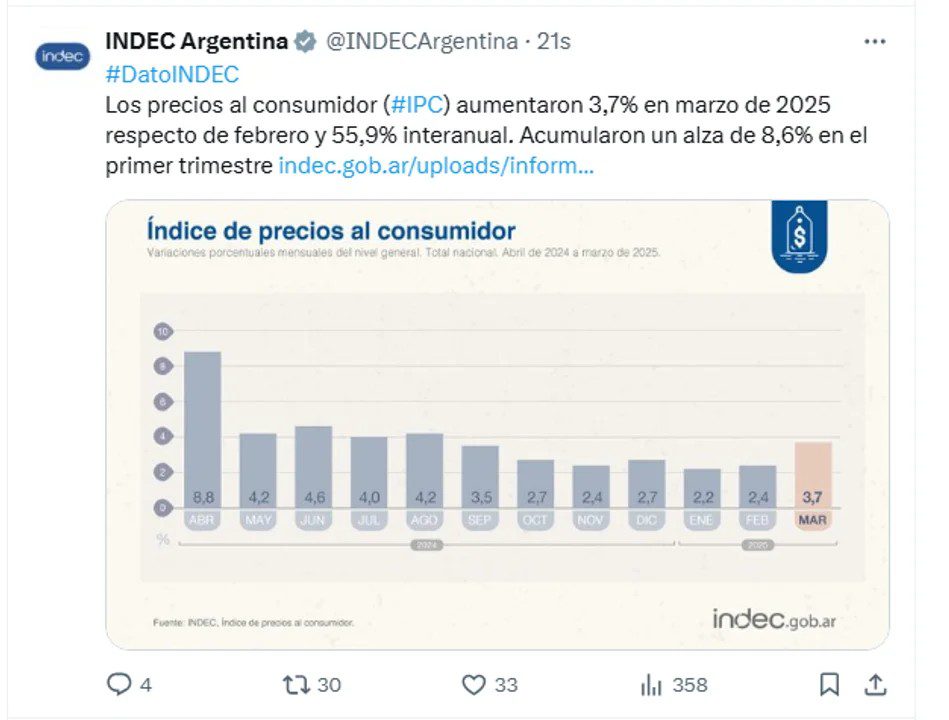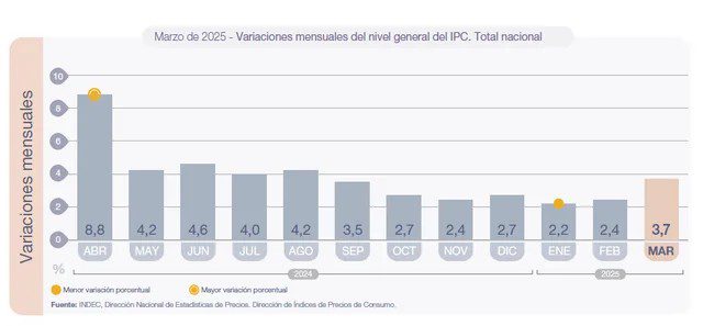 El dato nacional se conoce dos días después de que la Ciudad registrara un fuerte aumento, con un índice del 3,2% para marzo, 1,2 puntos porcentuales por encima del mes anterior.