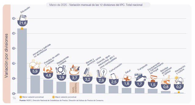La división de mayor aumento en el mes fue Educación (21,6%), con subas en todos los niveles educativos, por el inicio del ciclo lectivo.