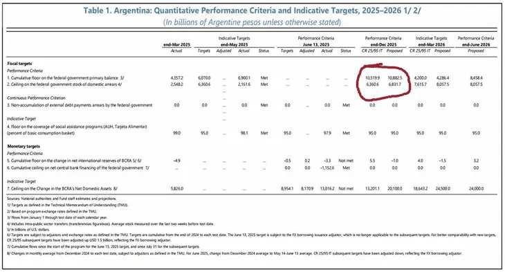 Un punto a tener en cuenta es que en la primera versión del acuerdo firmado en febrero de este año la meta fiscal era del 1,3% del PBI. Pero el presidente Javier Milei había planteado que igualmente la Argentina iba asumir por su cuenta llegar a fin de año con uno de 1,6%. Luego, en el proyecto de Presupuesto 2026 que presentó el gobierno en septiembre se fija como estimativo que el año va a cerrar con un superávit del 1,5% del PBI.