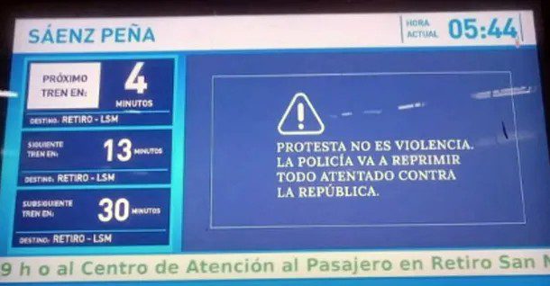 «Protesta no es violencia. La Policía va a reprimir todo atentado contra la república«, reza el mensaje que se difundió esta mañana en diversas pantalla de los Trenes Argentinos, entre ellos la línea San Martín y Sarmiento.