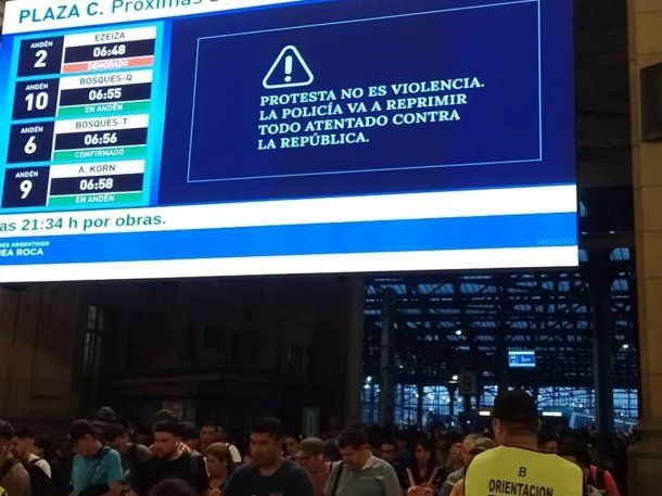 «Protesta no es violencia. La Policía va a reprimir todo atentado contra la república«, reza el mensaje que se difundió esta mañana en diversas pantalla de los Trenes Argentinos, entre ellos la línea San Martín y Sarmiento.
