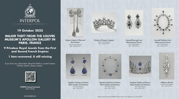 Tras el robo al Museo del Louvre de París, Interpol lanzó un alerta a nivel global e incluyó las piezas sustraídas a su base de datos de Obras de Arte Robadas. Pese a la recuperación de una corona que perteneció a la emperatriz Eugenia de Montijo, ocho objetos siguen desaparecidos.