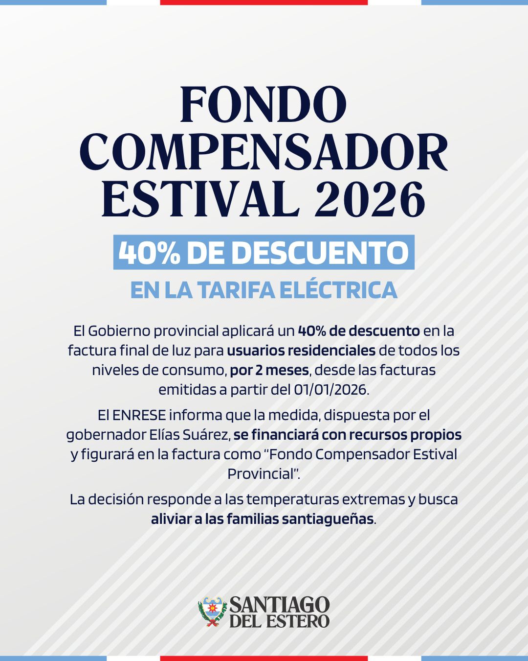 El Gobierno de la Provincia de Santiago del Estero comunicó este lunes una serie de medidas destinadas a acompañar a la comunidad durante la temporada de verano. Entre los anuncios más destacados, se confirmó la implementación de un descuento del 40% en las facturas de energía eléctrica para usuarios residenciales.