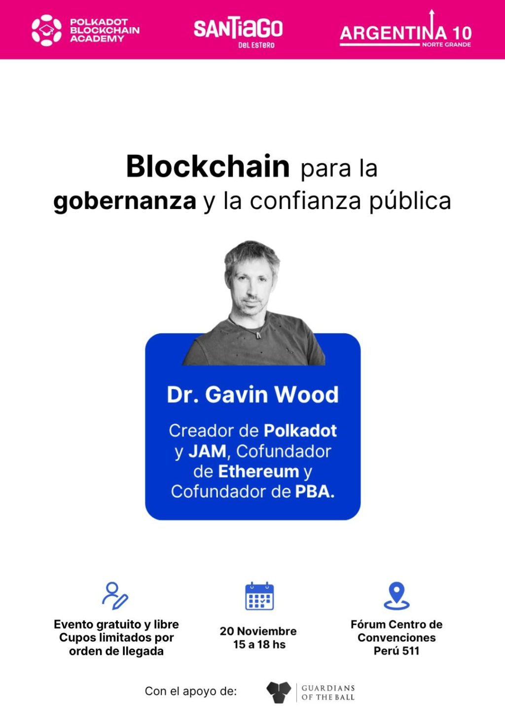 En el marco de una serie de exposiciones de divulgación sobre blockchain, innovación, finanzas descentralizadas y el futuro de la Web3, la ciudad de Santiago del Estero recibirá, mañana, jueves 20 de noviembre, al Dr. Gavin Wood, creador de Polkadot y cofundador de Ethereum, para hablar sobre uno de los temas centrales de su agenda global: la blockchain como nuevo contrato social y oportunidad para el crecimiento.