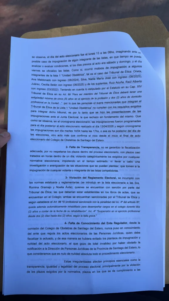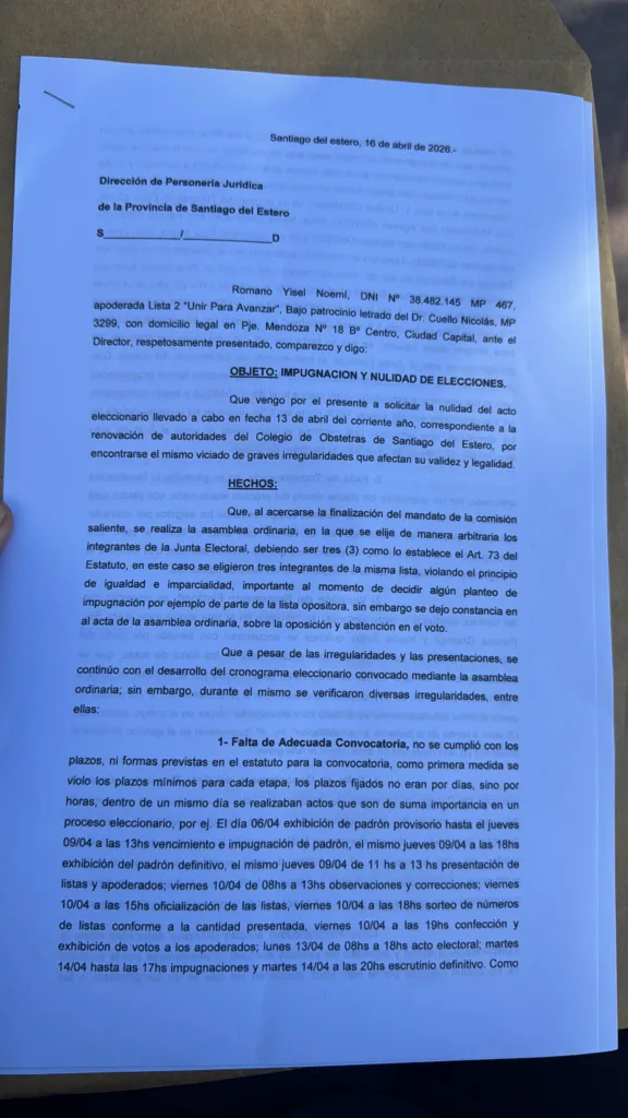 Este jueves 16 de abril, la interna del Colegio de Obstetras de Santiago del Estero sumó un capítulo judicial y administrativo de alto impacto. Bajo el patrocinio del Dr. Nicolás Cuello, la apoderada de la Lista 2 «Unir Para Avanzar» solicitó formalmente la impugnación y nulidad absoluta del acto eleccionario realizado el pasado 13 de abril, argumentando que el proceso estuvo plagado de irregularidades que afectan su validez legal.