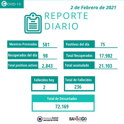 En tanto se procesaron un total de quinientas ochenta y un (581) muestras el día de hoy y se confirmaron setenta y cinco (75) casos, Capital-Banda (40) e interior de la provincia (35).
