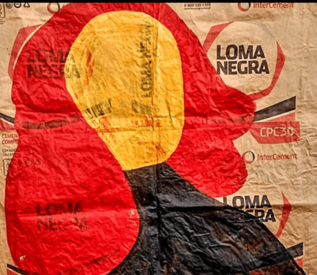 En una entrevista con la curadora, nos expresa que la obra de la autora refleja cabalmente los paisajes floridos, dolidos de la zona sur de Santiago del Estero –entre el Río Dulce y el Salado–, que parecen una cartografía del monte y su desmonte. Es Loma Negra sobándole el lomo al monte para extraer cemento y acuñar ciudad. ¿Quién es esa mujer que emerge de las bolsas de Loma Negra? ¿Es acaso una de las tantas que nadie sabía en dónde estaba y apareció cuando preparaban la tierra para inyectarle soja? Rostro de oro, restos de oro, rastros del oro.