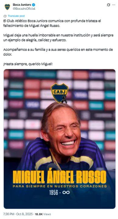 “El Club Atlético Boca Juniors comunica con profunda tristeza el fallecimiento de Miguel Ángel Russo. Miguel deja una huella imborrable en nuestra institución y será siempre un ejemplo de alegría, calidez y esfuerzo. Acompañamos a su familia y a sus seres queridos en este momento de dolor. ¡Hasta siempre, querido Miguel!”, comunicó el club xeneize en su cuenta oficial de X.