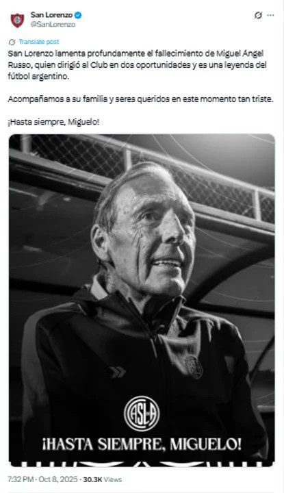 “San Lorenzo lamenta profundamente el fallecimiento de Miguel Ángel Russo, quien dirigió al Club en dos oportunidades y es una leyenda del fútbol argentino. Acompañamos a su familia y seres queridos en este momento tan triste. ¡Hasta siempre, Miguelo!”.