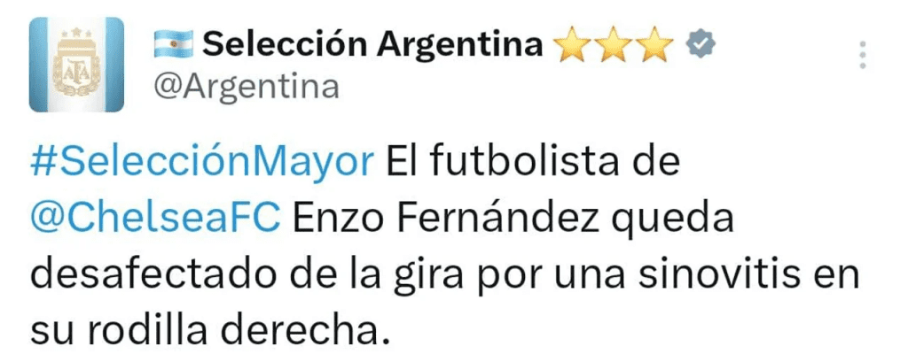 La Asociación del Fútbol Argentino confirmó la noticia mediante un mensaje de redes sciales. “ El futbolista de Chelsea FC Enzo Fernández queda desafectado de la gira por una sinovitis en su rodilla derecha”, manifestó en su escrito.
