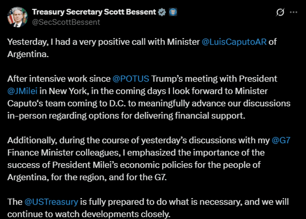 “Después de un intenso trabajo desde la reunión del presidente Donald Trump con el Presidente Javier Milei en Nueva York, en los próximos días espero que el equipo del Ministro Caputo venga a DC para avanzar significativamente en nuestras discusiones en persona sobre las opciones para brindar apoyo financiero”, indicó Bessent en una comunicación a través de redes sociales.
