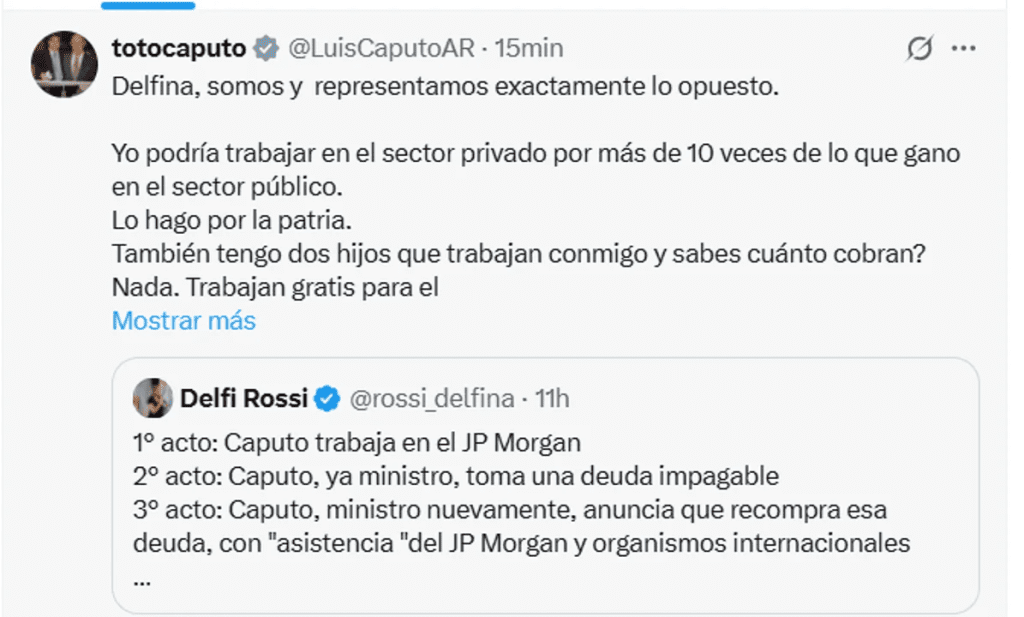A esto Caputo contestó: “Delfina, somos y representamos exactamente lo opuesto. Yo podría trabajar en el sector privado por más de 10 veces de lo que gano en el sector público. Lo hago por la patria”.