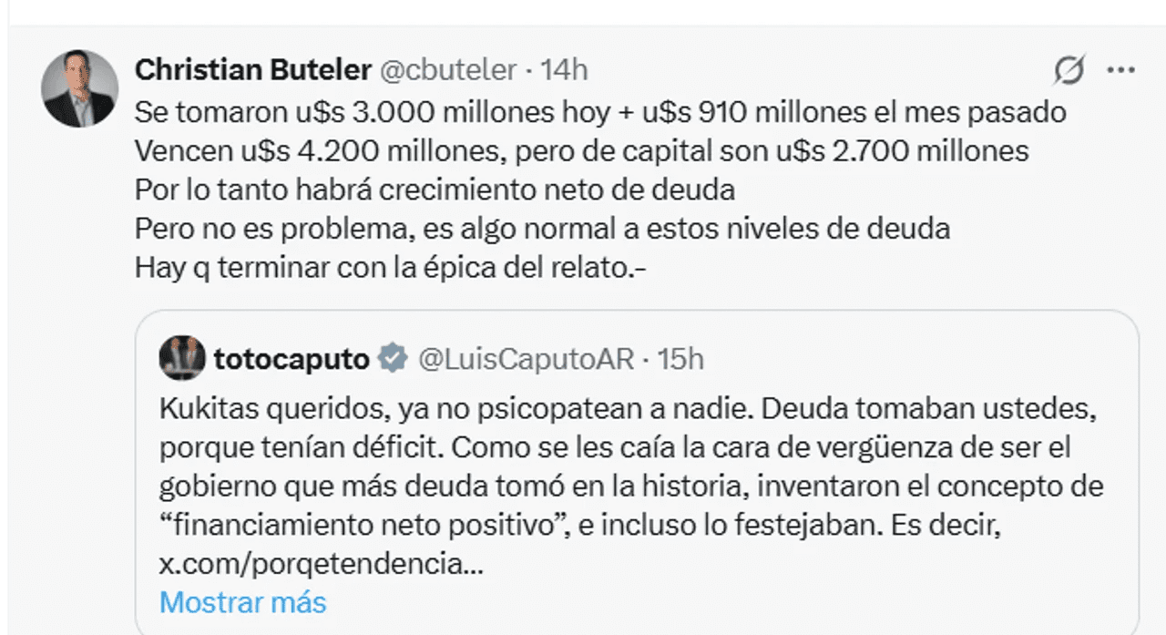“Se tomaron US$ 3.000 millones más US$ 910 millones el mes pasado (con el BONAR2029). Vencen US$ 4.200 millones, pero de capital son US$ 2.700 millones Por lo tanto, habrá crecimiento neto de deuda. Pero no es problema, es algo normal a estos niveles de deuda. Hay que terminar con la épica del relato”, lanzó Christian Buteler.