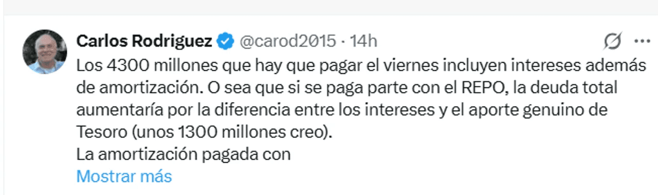 En un sentido similar se pronunció Carlos Rodríguez, ex asesor del presidente Javier Milei: “Los 4300 millones que hay que pagar el viernes incluyen intereses además de amortización. O sea que si se paga parte con el REPO, la deuda total aumentaría por la diferencia entre los intereses y el aporte genuino de Tesoro (unos US$ 1300 millones)”.