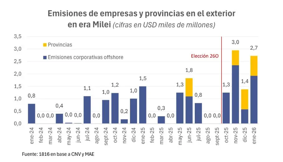 Esa rentabilidad asegurada está impulsando el nuevo ciclo de endeudamiento de las empresas, que en enero emitieron Obligaciones Negociables en el mercado internacional por 1.900 millones de dólares, en el mercado local por 1.300 millones de dólares y tomaron créditos en el sistema financiero por otros 1.100 millones de dólares (netos entre cancelaciones y nuevos préstamos).