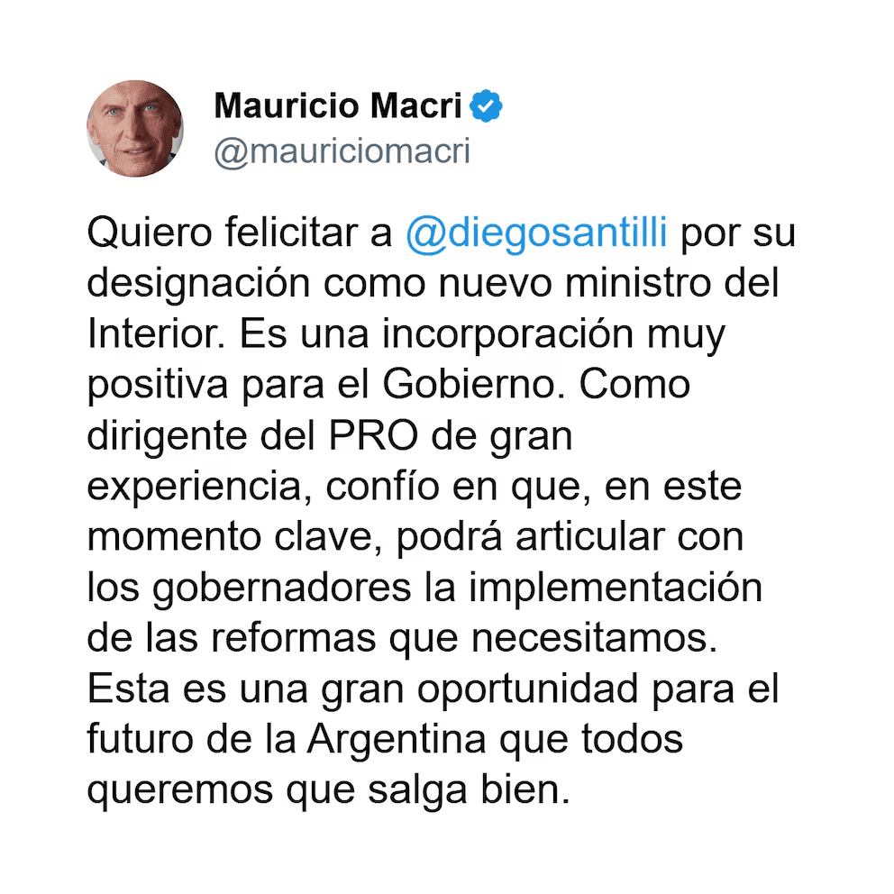 La aclaración responde a la necesidad de marginar la intencionalidad de Macri de hacerlo pasar como alguien del campamento propio. “Es una incorporación muy positiva para el Gobierno. Como dirigente del PRO de gran experiencia, confío en que, en este momento clave, podrá articular con los gobernadores la implementación de las reformas que necesitamos”, planteó el exmandatario aquel domingo a la tarde, tras la noticia, desde su cuenta de X.