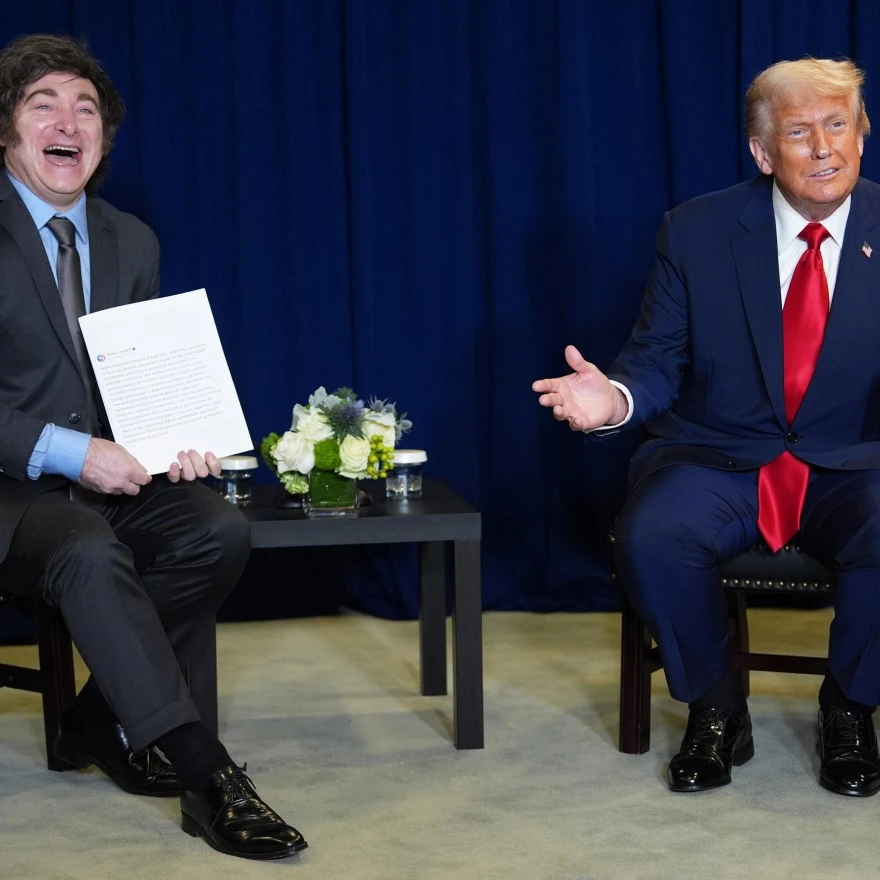 Unos minutos antes de la reunión, el presidente de EEUU publicó en sus redes un mensaje muy elogioso para el argentino, a quien calificó como «un fuerte aliado» y respaldó para un segundo mandato: «Javier Milei es un muy buen amigo, luchador y ganador, y tiene mi respaldo completo y total para la reelección como presidente». En la reunión, Trump le regaló a Milei el tuit impreso.