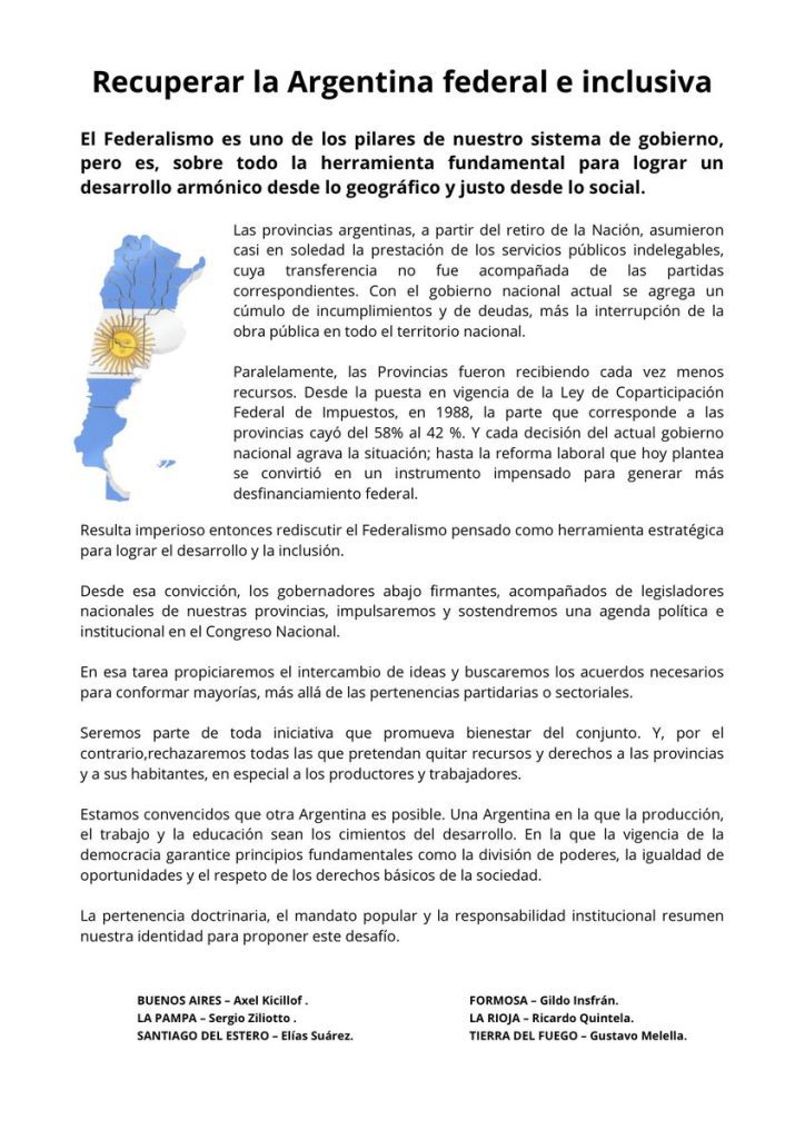 El documento lleva la firma de los gobernadores Axel Kicillof (Buenos Aires), Gildo Insfrán (Formosa), Sergio Ziliotto (La Pampa), Ricardo Quintela (La Rioja), Gustavo Melella (Tierra del Fuego) y Elías Suarez (Santiago del Estero).
