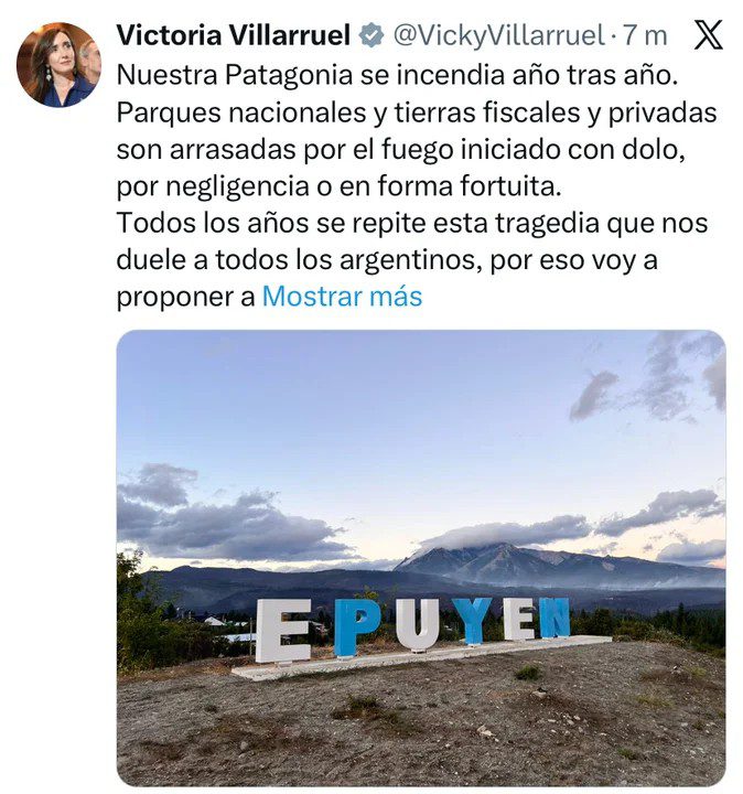 La vicepresidenta planteó que “nuestra Patagonia se incendia año tras año. Parques nacionales y tierras fiscales y privadas son arrasadas por el fuego iniciado con dolo, por negligencia o en forma fortuita”.